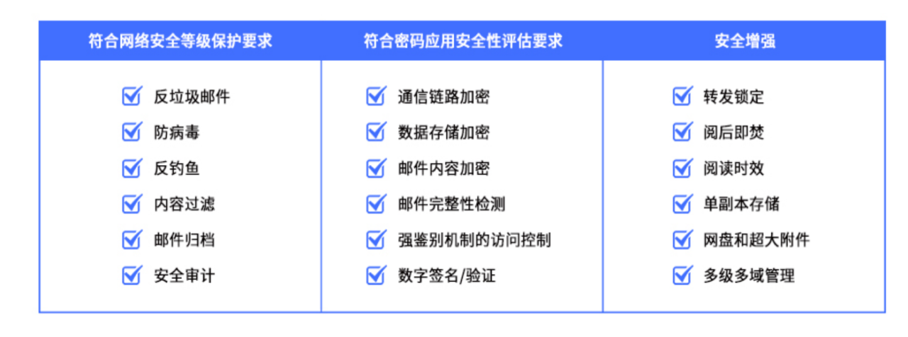 时代亿信互联网安全邮件系统获得公安部计算机信息系统安全专用产品销售许可证,满足网络安全等级保护要求,面向 党政机关事业单位、国有企业、金融行业及各大高校互联网电子邮件系统安全整治需求,提供防钓鱼、防窃密、防病毒、 反垃圾、内容过滤、安全审计等安全邮件功能。 时代亿信互联网安全邮件系统经过国家密码管理局商用密码检测中心检测,已取得商用密码产品认证证书,符合《密码 法》要求,符合密码应用安全性评估要求,采用国产密码算法,搭配密码设备,为邮件提供高强度加解密、签名验签服务。